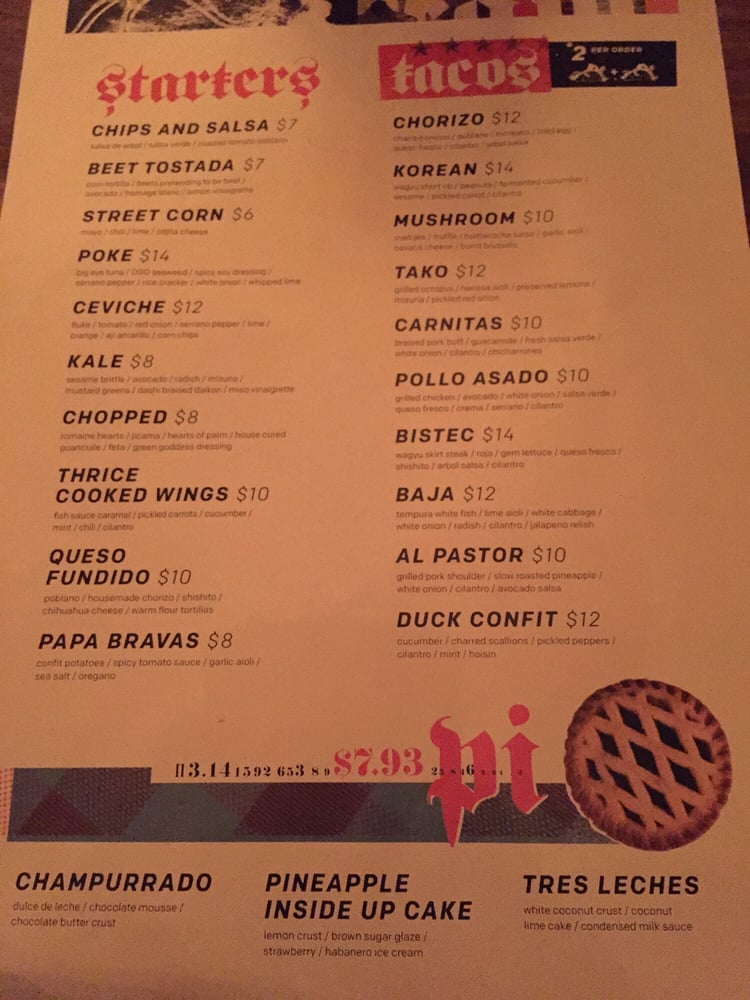 “ Täko is a cool Mexican restaurant in Downtown that I've been to a few times now with my girlfriend. They offer tacos and Mexican street food appetizers like street corn, chef's guacamole, & smoky roasted pepitas. The pepitas are amazing and I would highly recommend trying them! We wish they offered more popular Mexican food options like quesadillas but still enjoyed their food. We tried their featured drinks so I had their blueberry lemongrass mojito which was very refreshing. Aisha had their strawberry basil daiquiri which was just the right amount of sweetness for her. For entrees, I had the Maitake mushroom tacos and Aisha had the Pollo Asada tacos. If you're a vegetarian, their meat tacos can be replaced with potatoes to accommodate you. Just be sure to ask for the corn tortillas because their soft shells are cooked in beef fat! We enjoyed our time here but, as a heads up, it's one of those restaurants with very dim lighting and they also play popular music which was fun but loud. It's a cool date night spot but tough to hear each other over the music. We'll have to go in the summer to try their outdoor seating! ”