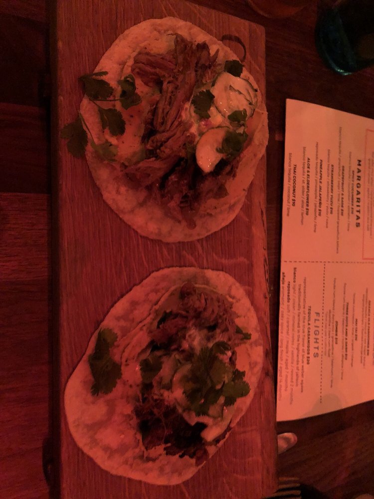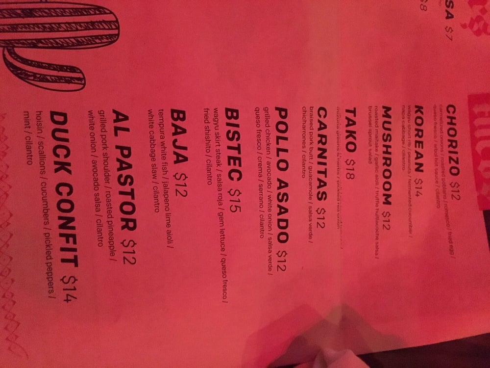 “ Wow! Blown away with how good the food is. We had the Baja fish and al pastor tacos and a side of guacamole. The tacos were so flavorful and 2 tacos were just the right amount of food. The deco of this place is super cool. Love the vibe. Pricey but it's a fun place to check out in the city. ”
